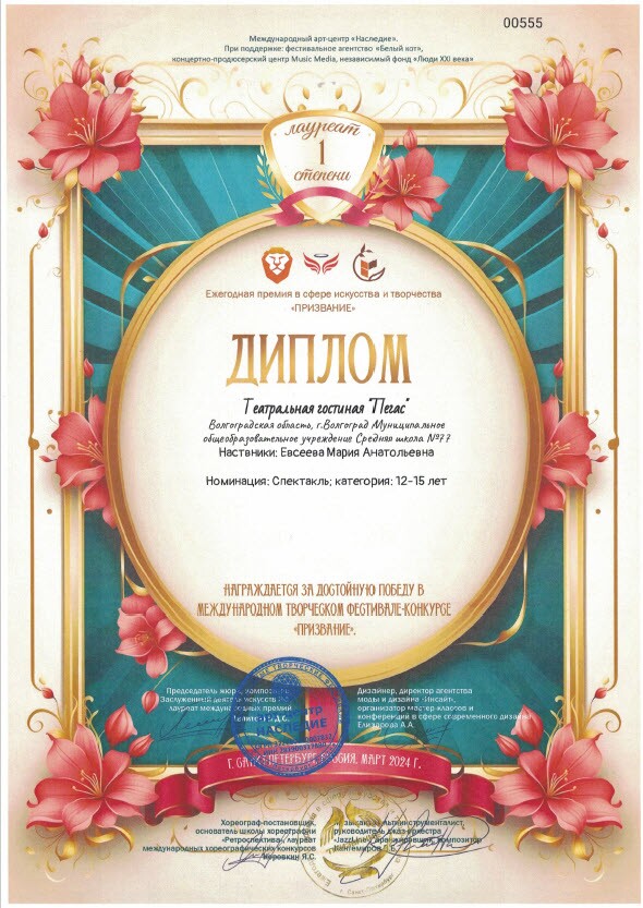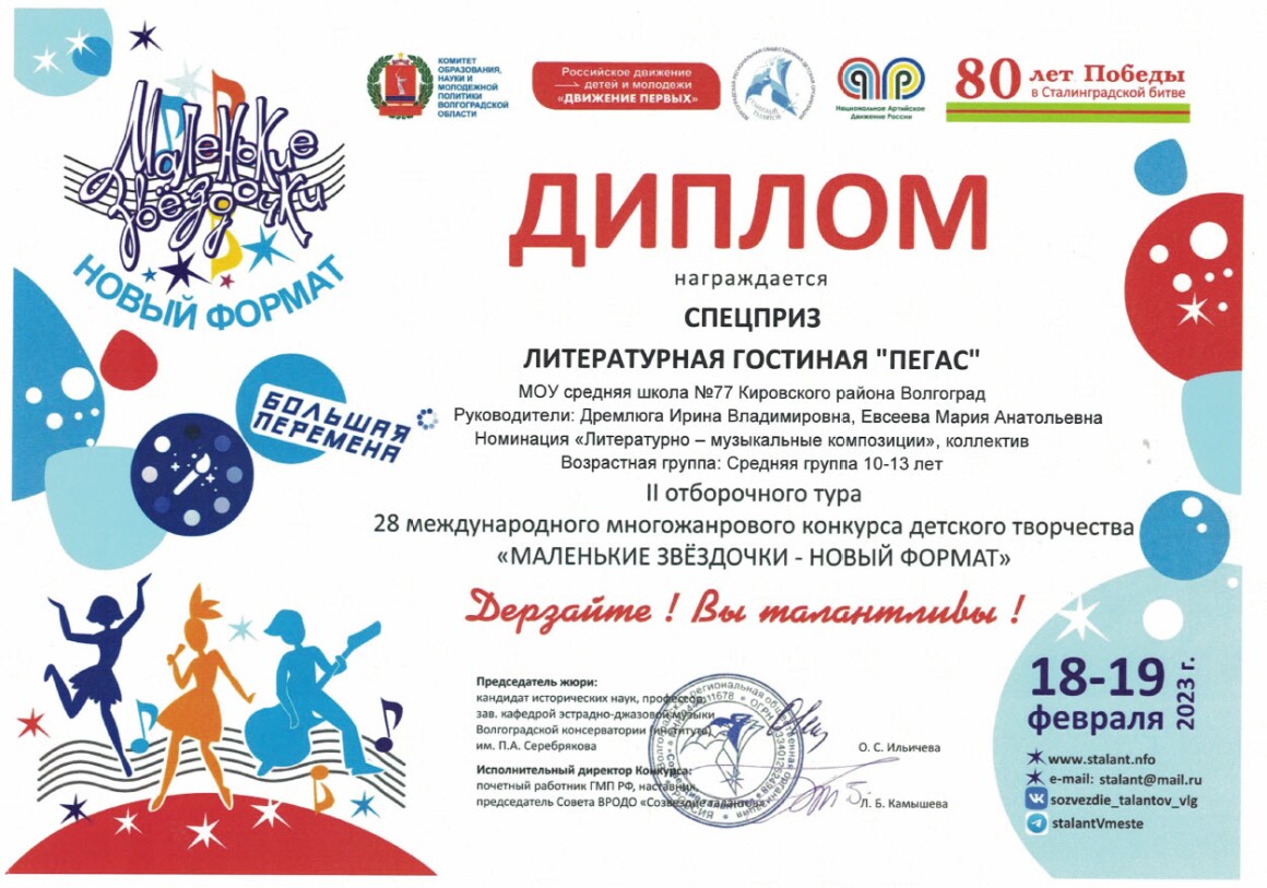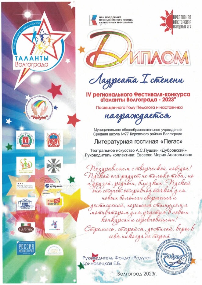 Литературная гостиная "Пегас" появилась в наше школе с 2023 года. Этот театральный кружок помогает детям лучше понимать самих себя и окружающий мир, развивать свои личностный качества и видеть собственный потенциал. Наши театральные занятия пробуждает у учащихся фантазию и воображение, учат сочувствие и сопереживанию. Здесь абсолютно каждый ученик может продемонстрировать свой талант, показать свои способности и воплотить самые дерзкие идеи. Атмосфера доверия, понимания, которая царит в нашей литературой гостиной, помогает очень тесно сотрудничать руководителю с учащимися нашей школы. Вместе мы учимся петь, танцевать, фантазировать, рисовать и играть на сцене.